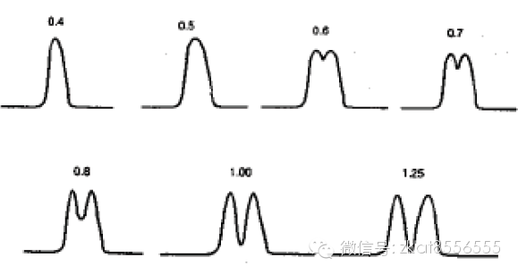 分离度(resolution,R):相邻两峰的保留时间之差与平均峰宽的比值。表示相邻两峰的分离程度。