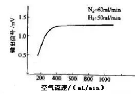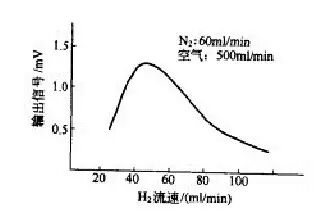 氢气作为燃烧气与氮气(载气)预混合后进入喷嘴当氮气流速固定时,随着氢气流速的蹭加,输出信号也随之增加,并达到一个**值后迅速下降。如下图所示。由图可见:通常氢气的**流速为40~60mL/min。有时是氢气作为载气,氮气作为补充气,其效果是一样的。