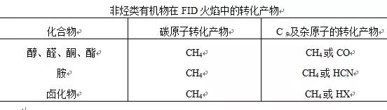 对非烃类化合物,其响应机理比较复杂,随所含官能团的不同而异,基本规律是不与杂原子相连的碳原子均转化成甲烷。杂原子及其相连的碳原子(C杂)的转化产物见下表。