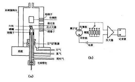 氢火焰离子化检测器(FID)由电离室和放大电路组成,分别如图(a),(b)所示。